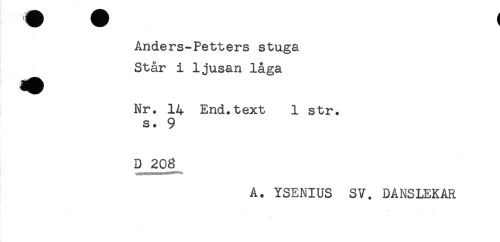 //// Änders-Petters stuga //// Står i ljusan låga //// Nr. 14 End.text 1 str. //// s. 9 //// D 203 //// A. YSENIUS SV. DANSLEKAR ////