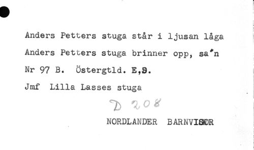 //// ^ //// t //// i< //// L //// t //// Anders Petters stuga står i ljusan låga //// Anders Petters stuga brinner opp, sa*n //// Nr 97 B. Östergtld. E,S. t //// Jmf Lilla Lasses stuga //// T) //// NORDLANDER BARNVISOR //// i //// ) //// : //// ! //// ) ////