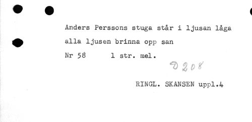 //// ! ^ ^ //// Anders Perssons stuga står i ljusan låga //// ^^ alla ljusen brinna opp san //// Nr 53 1 str. mel. //// RINCL. SKANSEN uppl.4 ////