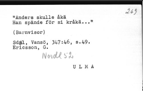 //// "Anders skulle åkä //// Han spände för si kråkä..." //// (Barnvisor) //// Sd$l, Vansö, 347:46, s.49. //// Ericsson, G. //// U L M A ////