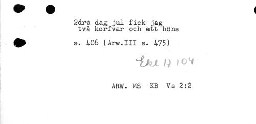 //// 2dra dag jul fick jag //// två korfvar och ett höns //// . //// s. 406 (Arw.III s. 475) //// p" //// ARW. MS KB Vs 2:2 ////
