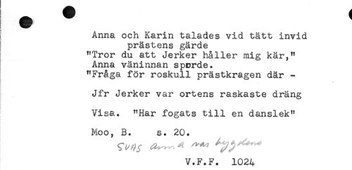 //// Anna och Karin talades vid tätt invid //// prästens gärde //// "Tror du att Jerker håller mig kär/' //// Anna väninnan sporde. //// "Fråga för roskull prästkragen där - //// . //// Jfr Jerker var ortens raskaste dräng //// Visa. "Har fogats till en danslek" //// Moo, B. s. 20. //// V.F.F. 1024 ////
