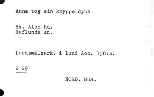 //// Anna tog sin knyppeldyna //// Sk. Albo hd. //// Raflunda sn. //// i //// Landsmålsark. i Lund Acc. 150:s. //// ! //// i //// D 29 //// NORD. MUS. //// t ////