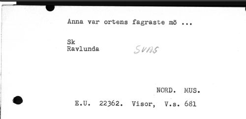 //// i Anna var ortens fagraste mö ... //// Sk //// Ravlunda //// i //// ' NORD. MUS. //// ! - //// ^ E.U. 22362. Visor, V.s. 681 ////
