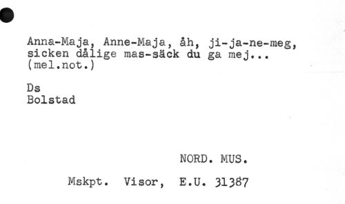 //// c //// Anna-Maja, Anne-Maja, åh, ji-ja-ne-meg, //// sicken dålige mas-såck du ga mej... //// (mel.not.) //// Ds //// Bolstad //// NORD. MUS. //// Mskpt. Visor, E.U. 31337 ////