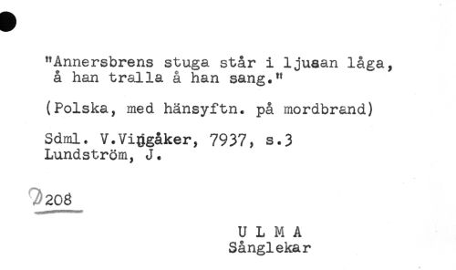 //// "Annersbrens stuga står i ljusan låga, //// å han tralla å han sang." //// (Polska, med hänsyftn. på mordbrand) //// Sdml. V.Vingåker, 7937, s.3 //// Lundström, J. //// 9 208 //// U L M A //// Sånglekar ////