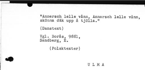 //// i "Annersch lelle vånn, Annersch lelle vånn, //// skönna däk upp å tjölla." //// (Danstext) //// Vgl. Borås, 9381, //// Sandberg, E. //// (Polsktexter) //// U L M A ////