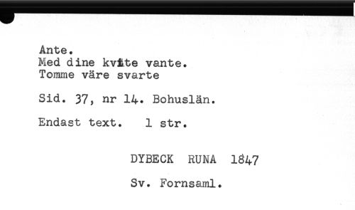 //// Ante. //// Med dine kv&te vante. //// Tomme väre svarte //// Sid. 37, nr 14. Bohuslän. //// Endast text. 1 str. //// DYBECK RUNA 1847 //// Sv. Fornsaml. ////