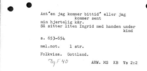 //// Ant*en jag kommer bittid* eller jag //// kommer sent //// min hjertelig kär. //// Så sitter liten Ingrid med handen under //// kind //// s. 653-654 //// mel.not. 1 str. //// Folkvi sa. Gottland. //// ^/P ARW. MS KB Vs 2:2 ////