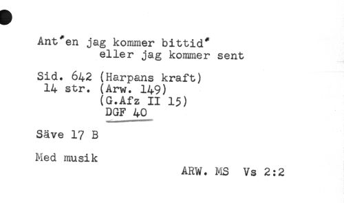 //// Ant*en jag kommer bittid" //// eller jag kommer sent //// Sid. 642 (Harpans kraft) //// 14 str. (Arw. 149) //// (G.Afz II 15) //// DGF_40 //// Säve 17 B //// Med musik //// ARW. MS Vs 2:2 ////