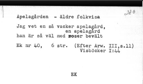 //// 1 J<fO //// Apelagården - äldre folkvisa //// t //// ! //// Jag vet en så vacker apelagård, //// en apelagård ! //// han är så väl med Boser bevält //// Ek nr 40, 6 str. (Efter Arw. III,s.11) //// Visböcker 1:44 //// t //// ! //// EK ////
