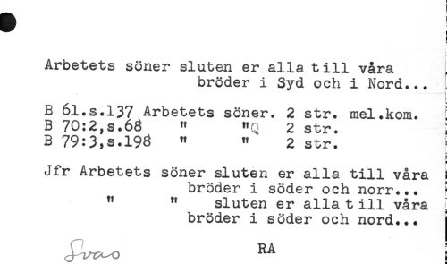 //// i //// t //// Arbetets söner sluten er alla till våra //// bröder i Syd och i Nord... [ //// i //// B 61.s.137 Arbetets söner. 2 str. mel.kom. ! //// B 70:2,s.68 " "Q 2 str. //// B 79:3,s.l98 " " 2 str. //// b //// B //// H //// Jfr Arbetets söner sluten er alla till våra ! //// bröder i söder och norr... ^ //// " " sluten er alla t ill våra ; //// bröder i söder och nord... //// RA i ////
