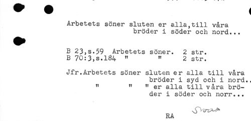 //// Arbetets söner sluten er alla,till våra //// bröder i söder och nord... //// B 23,s.59 Arbetets söner. 2 str. //// B 70:3,s.184 " " 2 str. //// Jfr.Arbetets söner sluten er alla till våra //// bröder i syd och i nord., //// " " " er alla till våra brö- //// der i söder och norr... //// RA ////