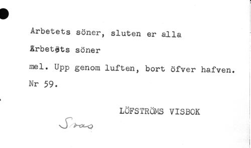 //// t //// i //// Arbetets söner, sluten er alla //// Rrbetgts söner //// mel. Upp genom luften, bort öfver hafven. //// Nr 59. //// < //// LÖFSTRÖMS VISBOK ////