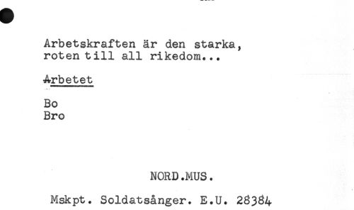 //// Arbetskraften är den starka, //// roten till all rikedom... //// Arbetet //// Bo //// Bro //// NORD.MUS. //// Mskpt. Soldatsånger. E.U. 28384 ////