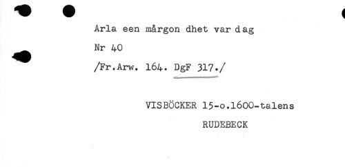 //// Arla een mårgon dhet var dag //// ^^ Nr 40 //// /Fr.Arw. 164. DgF 317. //// /« )Hn m r HH-p-tnn //// VISBÖCKER 15-o.1600-talens //// RUDEBECK ////