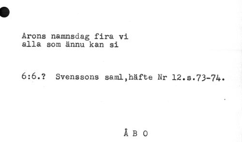 //// Arons namnsdag fira vi //// alla som ännu kan si //// 6:6.? Svenssons saml,häfte Nr 12.s.73-74. //// * ////
