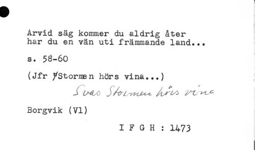 //// Arvid säg kommer du aldrig åter //// har du en vän uti främmande land... //// ! //// s. $8-60 //// (Jfr /Störnen hörs vina...) ! //// J ^ ^^ //// ^ //// Borgvik (VI) //// I F G H : 1473 ////
