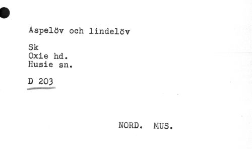 //// Aspelöv och lindelöv //// Sk //// Oxie hd. //// Husie sn. //// D 203 //// * //// * //// NORD. MUS. ////