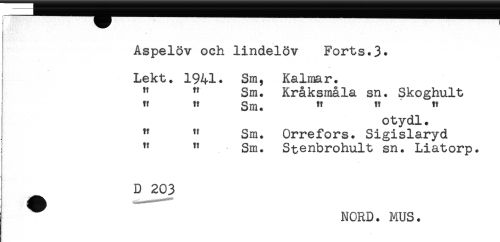 //// g //// Aspelöv och lindelöv Forts.3* //// t //// Lekt. 1941. Sm, Kalmar. //// " " Sm. Kråksmåla sn. Skoghult //// " " Sm. " " " //// a //// j otydl. //// " " Sm. Orrefors. Sigislaryd //// " Sm. Stenbrohult sn. Liatorp. //// D 203 //// ^ NORD. MUS. ////