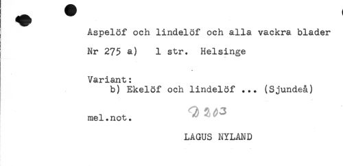 //// Aspelöf och lindelöf och alla vackra blader //// } Nr 275 a) 1 str. Helsinge //// i //// V&ni&nt * //// b) Ekelöf och lindelöf ... (Sjundeå) //// mel.not. ^ ^ //// LAGUS NYLAND ////