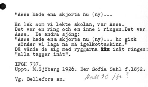 //// "Asse hade ena skjorta nu (ny)... //// En lek som vi lekte skolan, var Asse. //// Det var en ring och en inne i ringen.Det var //// Asse. De andra sjöng: //// "Asse hade ena skjorta nu (ny)... ho gick //// sönder vi laga na mä igelkottaskinn." //// Då vände de sig med ryggarna ååx inåt ringen: //// "alla taggar inåt". //// IFGH 737. //// Uppt. M.Sjöberg 1926. Ber Sofia Sahl f.1352. //// Vg. Bellefors sn. ' - ////