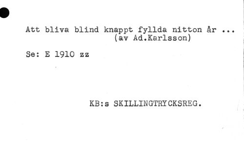 //// Att bliva blind knappt fyllda nitton år ... //// (av Ad.Karlsson) //// Se: E 1910 zz //// ! //// - //// < //// KB:s SKILLINGTRYCKSREG. //// * i ////