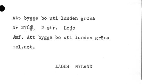 //// t //// Att bygga bo uti lunden gröna //// Nr 2766, 2 str. Lojo //// Jmf. Att bygga bo uti lunden gröna //// mel.not. //// LAGUS NYLAND ////