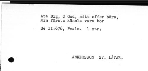 //// ' * - — * //// Att Dig, O Gud, mitt offer bära, //// Min första känsla vara bör //// *" ** * — — //// Se 11:676, Psalm. 1 str. //// i //// ^ ANBERSSON SV. LÅTAR. ////