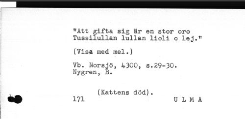 //// - //// tf //// t ** - - - . — //// { //// . //// "Att gifta sig är en stor oro //// { Tussilullan lullan lioli o lej." //// (Visa med mel.) //// * .. ** j //// Vb. Norsjö, 4300, s.29-30. //// Nygren, B. //// i //// (Kattens död). //// ## 171 U L M A ////
