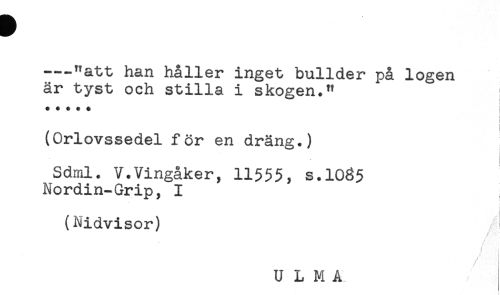 //// ---"att han håller inget bullder på logen //// är tyst och stilla i skogen." //// (Orlovssedel för en dräng.) //// Sdml. V.Vingåker, 11555, s.1035 //// Nordin-Grip, I //// (Nidvisor) //// U L M A ////
