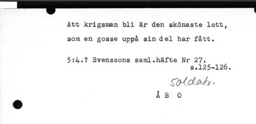 //// Att krigsman bli år den skönaste lott, //// som en gosse uppå sin del har fått. //// 5:4*? Svenssons saml.häfte Nr 27. //// s.125-126. //// Å Bi: 0 ////
