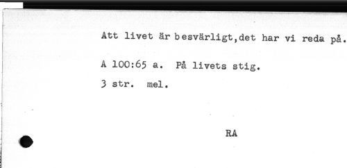 //// j //// J //// Att livet är besvärligt,det har vi reda på. //// A 100:65 a. På livets stig. //// 3 str. mel. //// - //// J //// i //// ^ RA ////