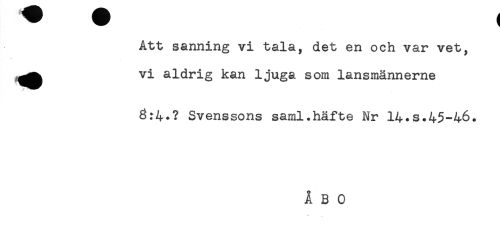 //// Att sanning vi tala^ det en och var vet, //// vi aldrig kan ljuga som lansmännerne //// 3:4.? Svenssons saml.häfte Nr 14.s.45-46. ////