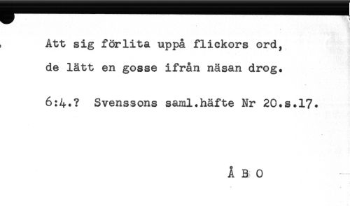 //// Hy ".-.1 //// Att sig förlita uppå flickors ord, //// de lätt en gosse ifrån näsan drog. //// 6:4.? Svenssons saml.häfte Nr 20.S.17. //// Å B 0 ////