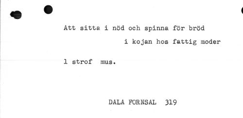 //// f* //// Att sitta i nöd och spinna för bröd //// i kojan hos fattig moder //// - //// I 1 strof mus. //// DALA FORNSAL 319 ////