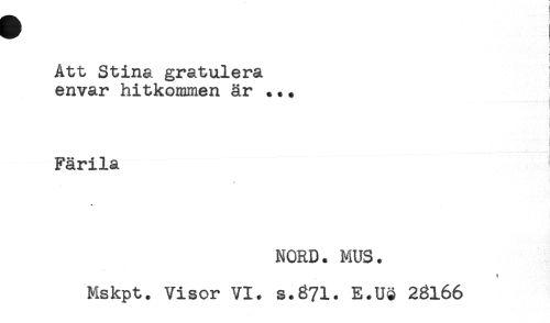 //// j //// Att Stina gratulera ! //// envar hitkommen är ..^ //// ! //// Färila //// * //// NORD. MUS. //// Mskpt. Visor VI. s.871. E.Ue 23166 ////