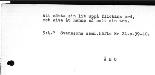 //// Att sätta sin lit uppå flickans ord, //// och giva åt henne sa helt sin tro. //// - . * //// 5:4.? Svenssons saml.häfte Nr 24.s.39-40. //// - //// ! //// j ÅBO ////