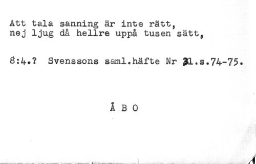 //// Att tala sanning är inte rätt, //// nej ljug då hellre uppå tusen sätt, //// 3:4*? Svenssons saml*häfte Nr 21.s.74-75. //// ÅBO //// ... ... ..... i ..;,. . .^.j. ^ ////