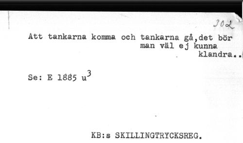 //// Att tankarna komma och tankarna gå,det bör //// man väl ej kunna //// klandra.. //// Se: E 1635 u^ //// KB:s SKILLINGTRYCKSREG. ////