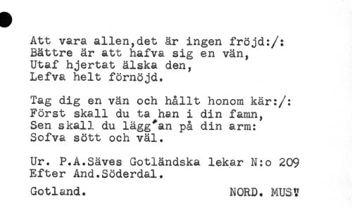 //// Att vara allén,det är ingen fröjd:/: //// Bättre är att hafva sig en vän, //// Utaf hjertat älska den, //// Lefva helt förnöjd. //// Tag dig en vän och hållt honom kär:/: //// Först skall du ta han i din famn, //// Sen skall du lägg*an på din arm: //// Sofva sött och väl. //// Ur. P.A.Säves Gotländska lekar N:o 209 //// Efter And.Söderdal. //// Gotland. NORD. MUSV ////