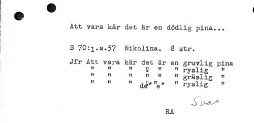 //// ! Att vara kär det är en dödlig pina... //// B 70:i.s.57 Nikolina, g str. //// Jfr Att vara kär det är en gruvlig pina //// " " " K " " ryslig " //// " " " " " " gräslig " //// " " " d<?*"e* " ryslig " //// RA ////