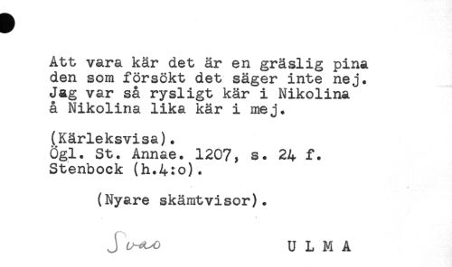 //// Att vara kär det är en gräslig pina //// den som försökt det säger inte nej. //// Jag var så rysligt kär i Nikolina //// å Nikolina lika kär i mej. //// (Kärleksvisa). //// Ögl. St. Annae. 1207, s. 24 f. //// Stenbock (h.4:o). //// - //// (Nyare skämtvisor). //// J U L M A ////