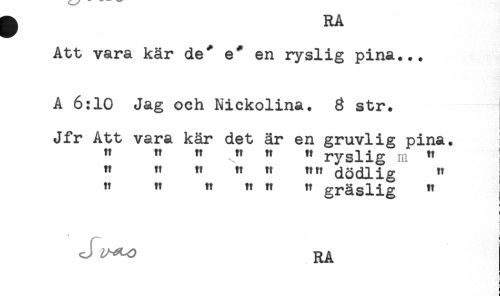 //// Att vara kär de" e* en ryslig pina... //// A 6:10 Jag och Nickolina. 8 str. //// i //// Jfr Att vara kär det är en gruvlig pina. ! //// " " " " " " ryslig m ^ //// tt t! tt tt tt TttT dödj_ig tt //// " ^ ^ " " ^ gräslig ^ //// < //// ! //// ' t- //// J RA ////
