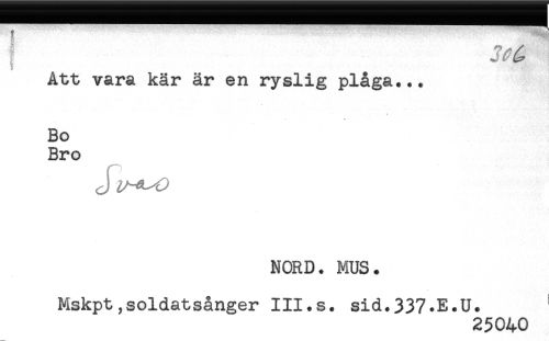 //// ^ v..... —^ //// } J^^ //// Att vara kär är en ryslig plåga... //// Bo //// Bro //// Jy-A^) //// NORD. MUS. //// Mskpt,soldatsånger III.s. sid.337.E.U. ' //// 25040 ////