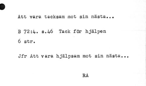 //// Att vara tacksam mot sin nästa... //// B 72:4. s.46 Tack för hjälpen //// 6 str. //// 1 //// Jfr Att vara hjälpsam mot sin nästa... //// RÅ ////