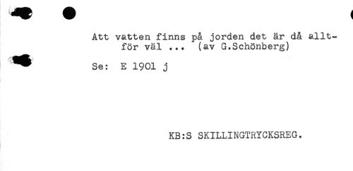 //// Att vatten finns på jorden det är då allt- //// för väl ... (av G.Schönberg) //// Se: E 1901 j //// i //// KB:S SKILLINGTRYCKSREG. ////