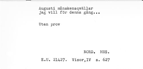 //// Augusti månskensqvällar //// jag vill för denna gång... //// Utan prov //// NORD. MUS. //// E.U. 21427. Visor,IV s. 627 ////