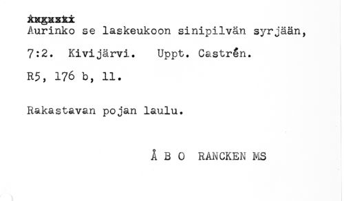 //// JHJN^iR^JKJL //// Aurinko se laskeukoon sinipilvän syrjään, //// 7:2. Kivijärvi. Uppt. Castrån. //// R5, 176 b, 11. //// Rakastavan pojan laulu. //// ÅBO RANCKEN MS ////