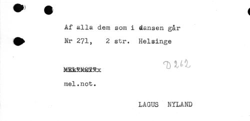 //// ^ v 1 //// Af alla dem som i dansen går //// ^ Nr 271, 2 str. Helsinge //// MERKMEXXx //// mel.not. //// LAGUS NYLAND ////